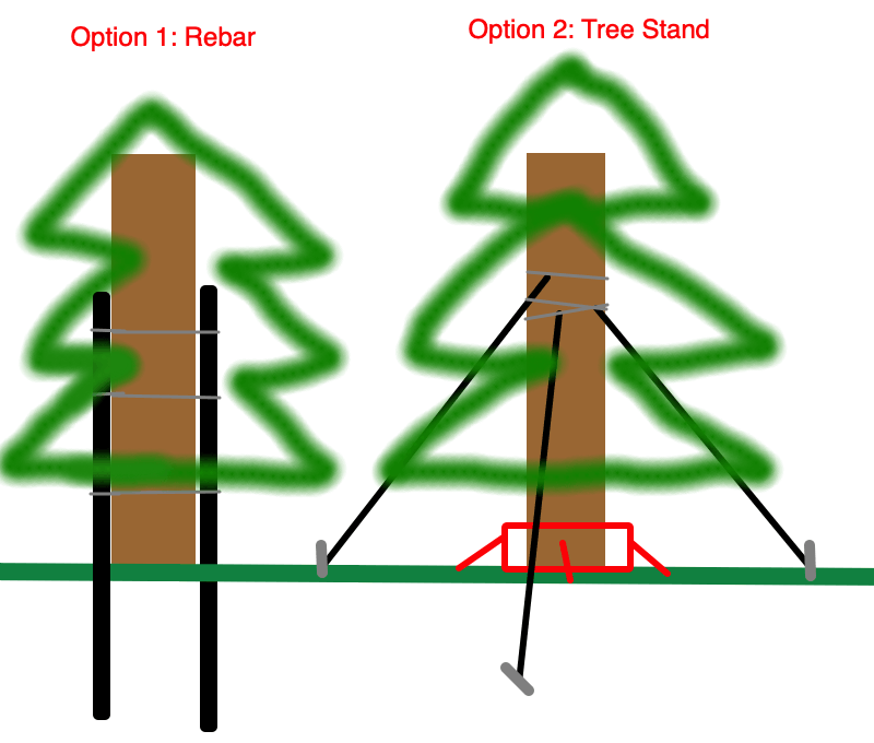 2 pieces of rebar, pushed into the ground and then mounted tight against the tree trunk with string. If you push the stake into the ground enough, this will be a good, sturdy solution to keep the tree upright.